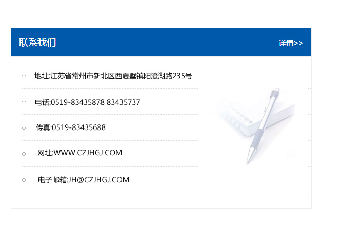 地址:常州市新北區友邦商務大廈1幢16、17層  電話:0519-85101652  傳真:0519-85112595  郵編:213022  網址:www.cz-jiayue_cn.wlyjf.com  郵箱:xiajifengaa@163.com